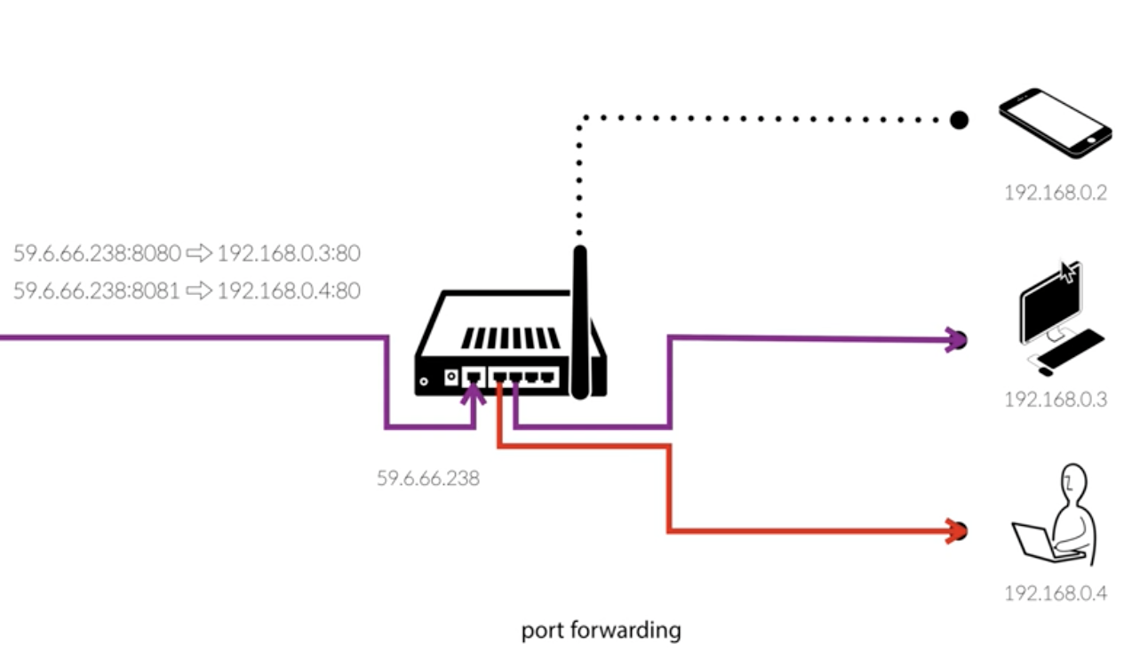 라우터 설정을 통해 퍼블릭아이피 (59.6.66.238)에서 포트번호 8080 으로 접속하면 >> 192.168.0.3:80으로 보내줘~