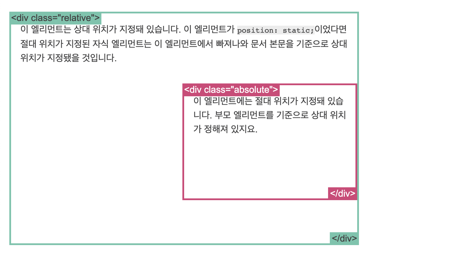 absolute는 뷰포트에 상대적으로 위치가 지정되는 게 아니라 가장 가까운 곳에 위치한 조상 엘리먼트에 상대적으로 위치가 지정된다는 점을 제외하면 fixed와 비슷하게 동작합니다