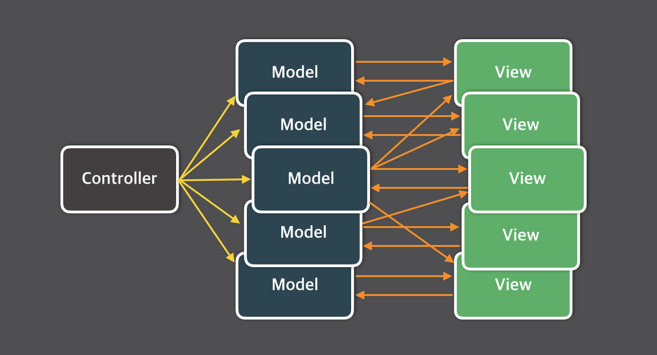 매우 효율적인 디자인 패턴이지만 점점 고도화 되는 웹어플리케이션에는 부적합하여 안정적인 상태관리가 필요해짐.