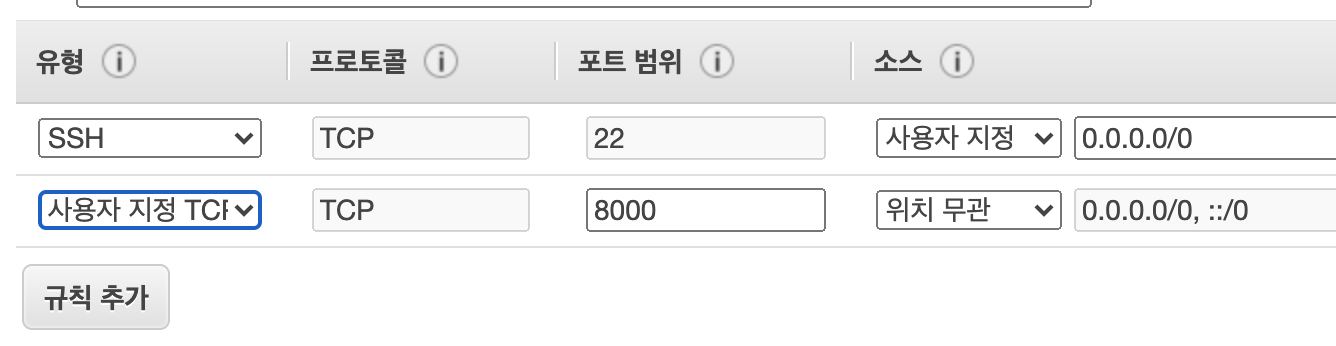 - EC2에서 포트 8000으로 웹서버를 돌리고 API호출이 되게 하려면 포트8000에 어떤 IP든 접속 할 수 있게 설정 추가해줘야한다