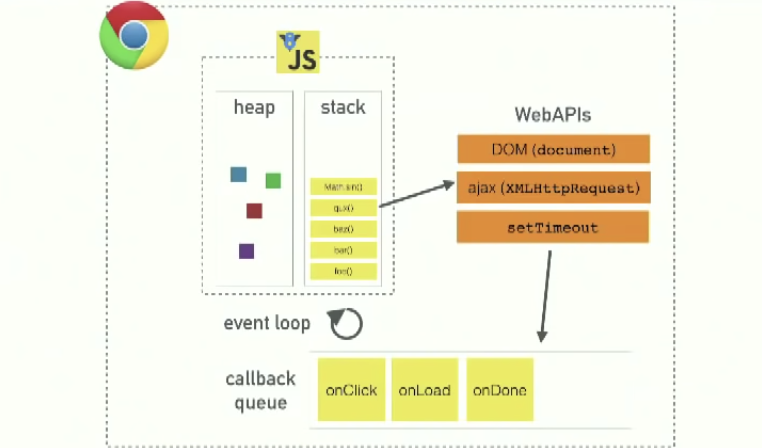 하나의 콜 스택을 가지고 있다는 말은 한 번에 하나의 동작만 할 수 있다는 의미입니다. 하지만 버젓이 setTimeout이나 ajax(HTTP 요청), DOM 이벤트 등 콜백으로 비동기 동작을 하도록 코딩하고 있습니다. 심지어 V8 소스에는 이러한 메서드들이 정의되어 있지도 않습니다.