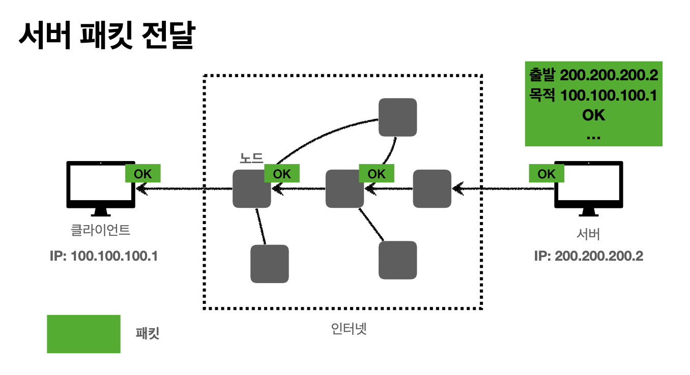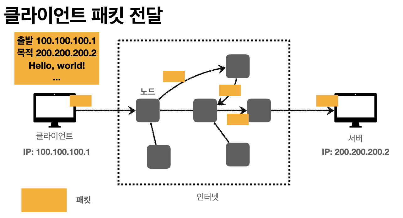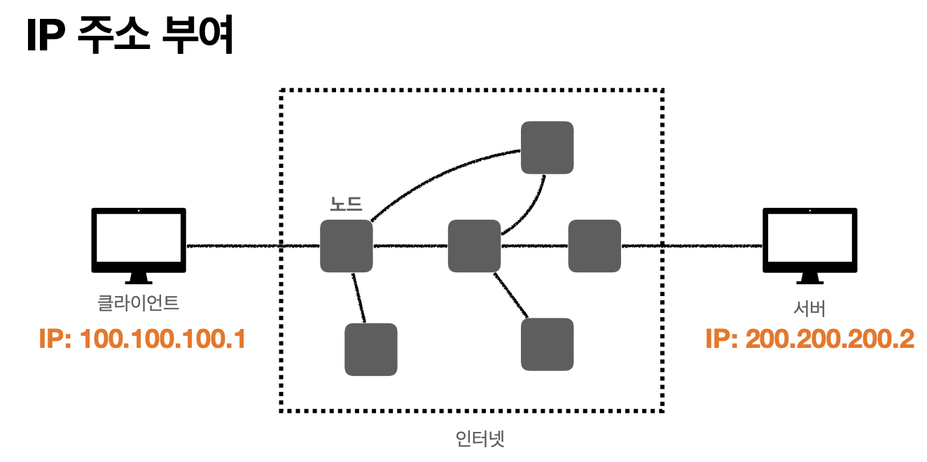 웹이나 HTTP도 인터넷 네트워크 안에서 일어난다. 인터넷 망을 통해 두 컴퓨터가 통신하기 위해서 여러 노드를 거치는 데, 이 요청을 잘 전달하기 위한 방법이 IP(인터넷 프로토콜)이다.