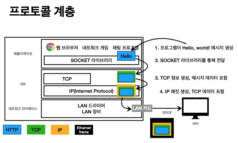 - 규약을 따라서 출발지 목적지를 노드끼리 읽는다(출발지IP, 목적지IP, 기타정보, 전송할 데이터)